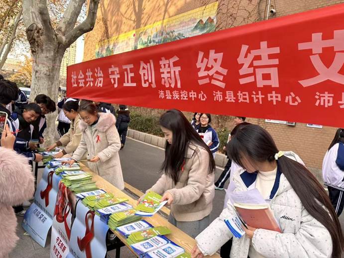 教室外的宣传区域同样热闹。沛县疾控中心精心设置的展板、展台前人头攒动,醒目的条幅传递着“社会共治 守正创新 终结艾滋”的理念。工作人员向过往师生发放宣传折页,耐心解答大家关于艾滋病防治的疑问,详细介绍相关政策与便民服务,让防艾知识覆盖到更多师生,进一步扩大了宣传影响力。