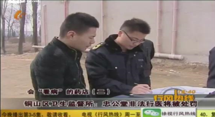 “铜山区茅村镇叶台村东头,‘忠公堂’药店有非法行医的行为,请前往查处”。 2016年2月22日,铜山区卫生监督所接到市卫生监督所转发一起非法行医投诉事件。铜山区卫生监督员和徐州经济频道记者于当日赶赴现场,对该药店进行调查处理。
