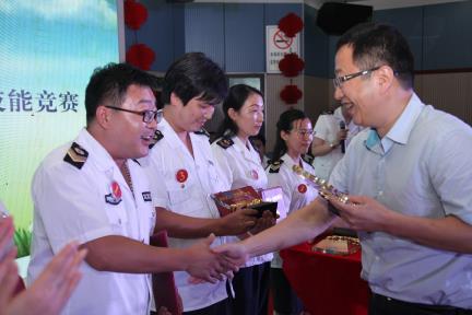 比赛前,市卫生监督所周丽玲副所长宣布了竞赛规则,接着参赛选手闪亮登场,紧张的比赛拉开帷幕。本次比赛采取现场知识竞答的方式,分必答题、抢答题和风险题三个环节,并设有专家组进行专业评判。比赛中选手们精彩发挥、你追我赶、悬念丛生,经过三轮的激烈角逐,市卫生监督所代表队和邳州市卫生监督所打成平手,比赛进入加赛环节,在加赛过程中,两个代表队的队员们全力以赴,群策群力,其中市卫生监督所代表队发挥出色,果断选择六十分风险题,后来居上,获得团体一等奖的荣誉。最终,邳州市、新沂市代表队获得团体二等奖,沛县、云龙区、睢宁县获得团体三等奖。市卫生监督所代表队周刘芳、李大伟,邳州市代表队李斌,睢宁县代表队王琼,新沂市代表队王娟等5名同志获得徐州市“五一劳动奖章”和技能标兵荣誉称号,曹恋秋、朱美红、周亚东、郑玉侠、石祥威、顾晨光、魏红 、邓亚雷等8名同志获得技术能手荣誉称号。