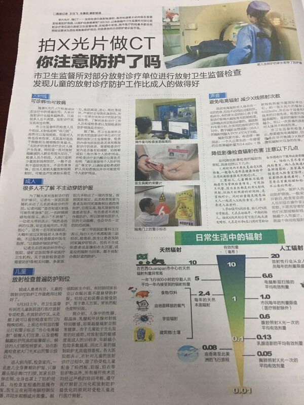 8月3日,徐州市卫生监督所走进徐州市儿童医院开展放射防护专项监督检查及放射防护知识的宣传。监督一处吴刚处长接受了媒体的采访,他从放射诊疗机构证件、设备、人员的资质,放射机房的选址、设计、检测、防护、温馨提示以及受检者及陪护人员的注意事项等方面详细解答了媒体的提问。徐州市各大媒体、网站均对我所放射卫生监督工作做了报道。徐州夜新闻,都市晨报、彭城晚报、徐州广播电台新闻频道、全程导医网均先后以“拍X片,做CT,你注意防护了吗”、“拍X光片要穿防护服,你知道吗” “徐州市卫生监督所对我市放射诊疗机构开展专项监督检查”、“徐州市卫生监督所走进市儿童医院开展医疗放射宣传活动”等为题做了大幅报道。