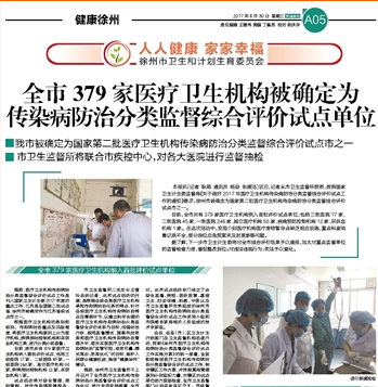 医疗卫生机构传染病防治分类监督综合评价试点工作是列入国家卫生计生委2017年度的重点工作,江苏是全国第二批试点省,徐州市被确定为江苏省级试点城市之一。试点工作根据医疗卫生机构的类别和级别、传染病防治重点及风险程度,将医疗卫生机构原则上分为医疗机构、疾病预防控制机构和采供血机构三类,分别对综合管理、预防接种、法定传染病疫情报告、传染病疫情控制、消毒隔离制度执行情况、医疗废物处置和病原微生物实验室生物安全管理、监督抽检等8大方面进行分类分级监督。目前,我市共有379家医疗卫生机构纳入评价试点,包括三级医院17家、二级医院45家、一级医院246家、其它医疗机构58家、疾病预防控制机构12家、采供血机构1家。
