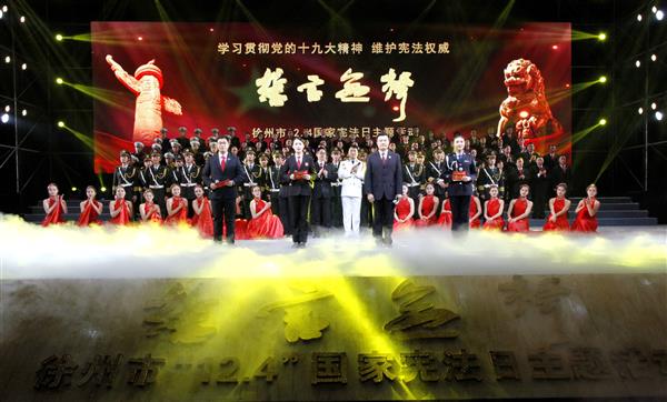 此次主题活动分为法治文艺汇演和向宪法宣誓两大部分。法治文艺会演涵盖歌曲、舞蹈、诗朗诵、小品、曲艺说唱、校园情景剧等节目形式,其中,柳琴歌舞《群英榜》以徐州本土柳琴戏为表演形式,歌颂了彭城和事佬王传立、普法鸳鸯熊为义夫妇等徐州法治模范事迹,赢得在场观众的热烈掌声。在精彩的文艺汇演后,卫生监督员代表和全体人员进行了宪法宣誓活动。