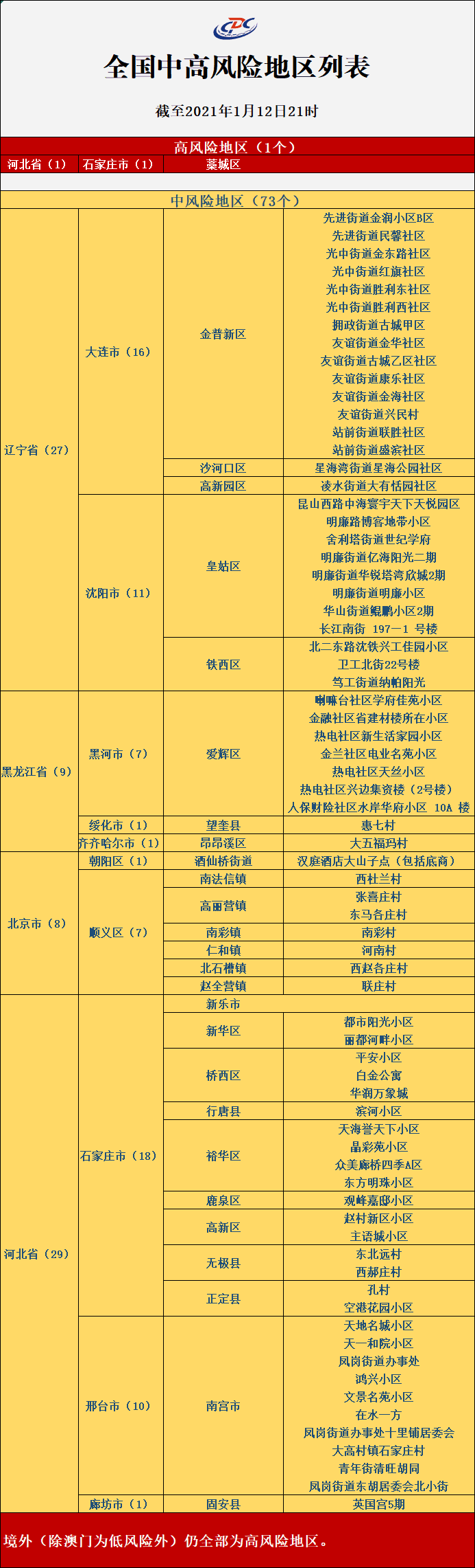 至2021年1月11日21时,全国各县区疫情风险等级情况如下:全国有1个高风险地区,83个中风险地区: