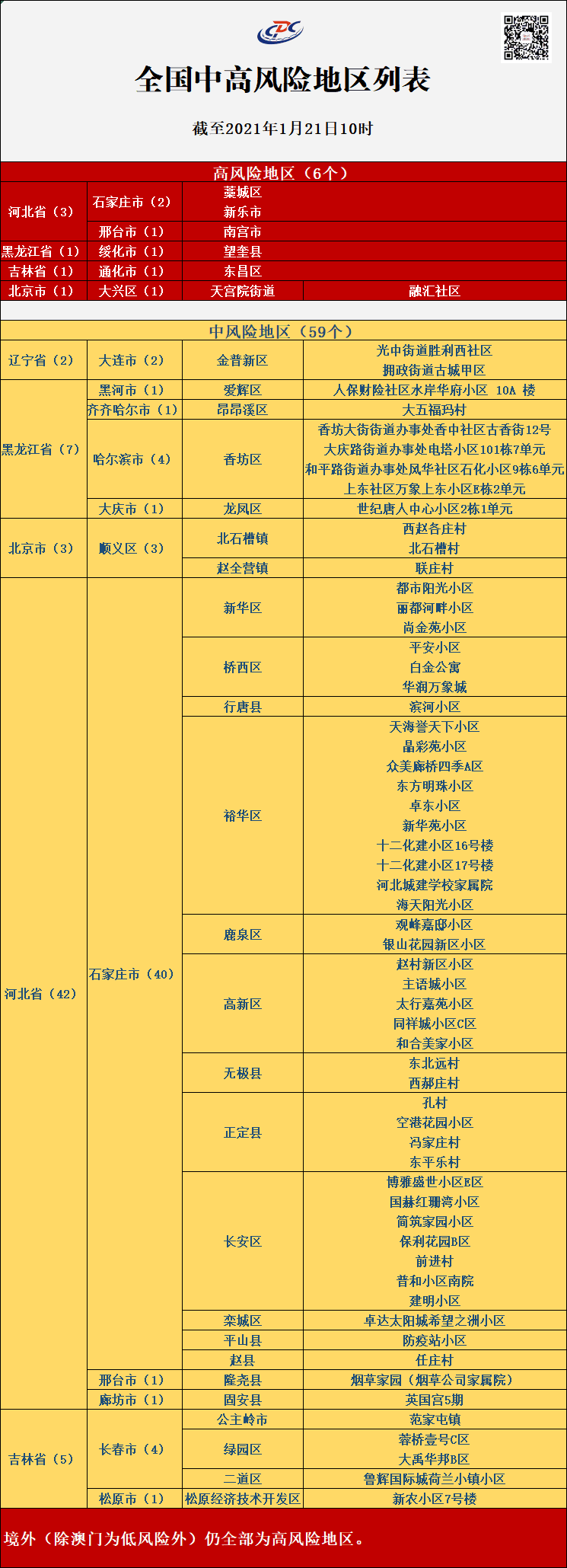 至2021年1月21日10时,全国各县区疫情风险等级情况如下:全国有6个高风险地区,59个中风险地区: