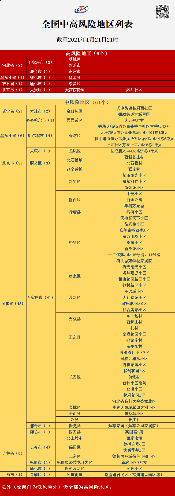 至2021年1月21日21时,全国各县区疫情风险等级情况如下:全国有6个高风险地区,61个中风险地区: