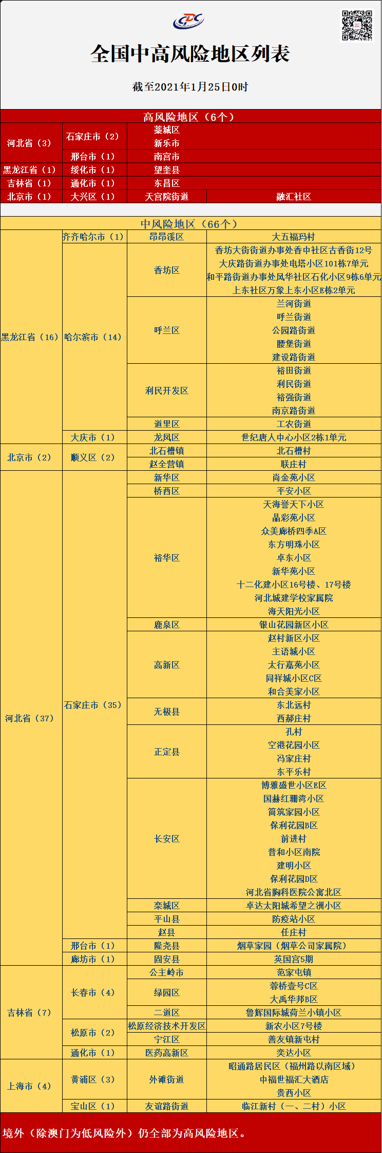至2021年1月25日0时,全国各县区疫情风险等级情况如下:全国有6个高风险地区,66个中风险地区: