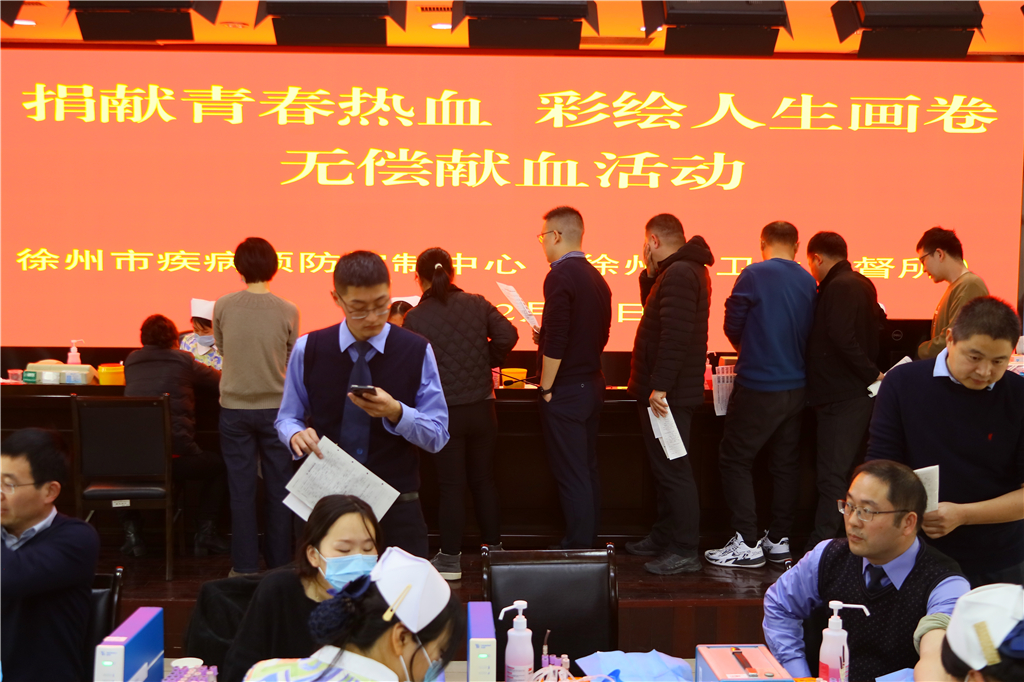 为积极响应徐州市卫生健康委关于《启动全市医疗卫生单位春节前后血液安全保障预案的通知》, 2月28日下午,徐州市疾病预防控制中心(徐州市卫生监督所)组织干部职工开展以“捐献青春热血,展现疾控风采”为主题的无偿献血活动。