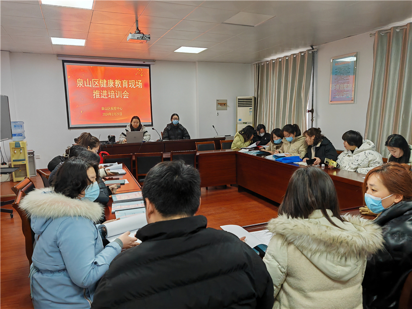 本次现场推进会第一阶段在泉山区疾控中心对健康教育印刷音像资料、宣传栏设置、健康教育讲座、讲座的需求评估和效果评估以及公众咨询活动、控烟宣传、个性化健康教育等台账资料方面进行了详细指导,同时对现场基层人员提出的问题进行了详细解答。第二阶段在永安社区卫生服务中心以现场会的形式对中心健康教育建设工作从氛围营造、健康教育室、健康教育宣传栏、健康教育资料架、健康教育联播平台播放、控烟工作以及特色功能室展示等环节进行了逐一点评。
