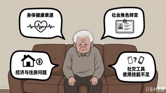身体机能衰退:随着年龄的增长,慢性疾病、行动不便、听力或视力受损等健康问题可能限制老年人参与社会活动的能力,使得孤独感与社会隔绝的状态进一步加深。社会身份的转变:退休后回归家庭、开启赋闲生活,是每位老年人都会经历的重要人生节点,这一转变往往会让他们在工作期间积累的社交联系大幅减少。此外,丧偶、子女离家等事件,也可能导致老年人失去身边关键的情感支撑。