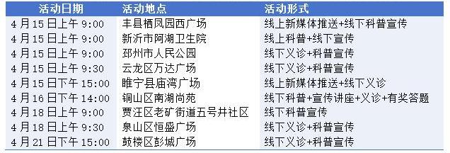 为扩大防癌科普宣传范围,提升全社会癌症防控意识,营造全民参与防癌抗癌的良好氛围,由徐州市卫生健康委员会主办,徐州市肿瘤防治管理中心、徐州市疾病预防控制中心、云龙区卫生健康委员会、徐州市肿瘤医院承办的启动仪式将于4月15日上午9点30分在云龙万达广场2号门隆重举行。届时,将组织多位知名专家开展义诊服务,并进行科普宣讲,为公众提供专业指导。