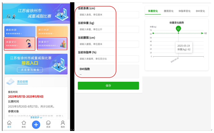 进入小程序页面,点击最下方的加号,就可以在比赛期间,记录身体变化啦,填写当前体重等信息,在“体重变化”模块将自动生成数值曲线,了解期间的体重、腰围、体脂率、BMI变化。后期还可以通过查看“体重排行”模块,了解自己在比赛中体重变化的排行情况。