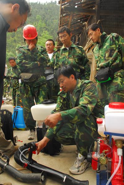 市疾控中心抗震救灾队员薛诚在教其他队员使用喷雾器