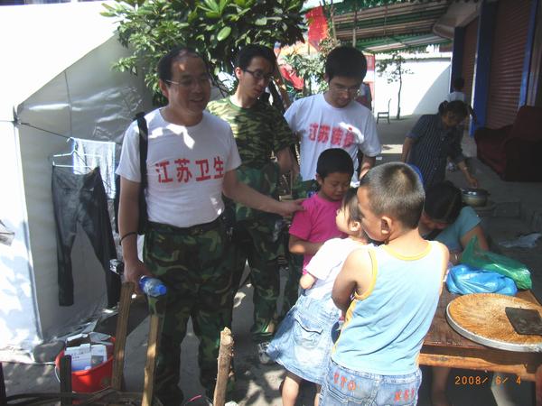江苏卫生防疫救援队6队队员在帮助清理环境垃圾