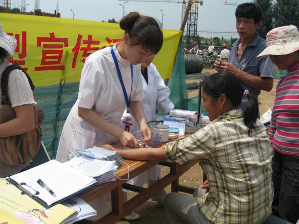6月24日,新沂市疾控中心组织专业人员深入“百力康城”等大型建筑工地和火车站、汽车站候车室,为农民工送去“关爱生命,心系农民工健康”艾滋病防治知识。
