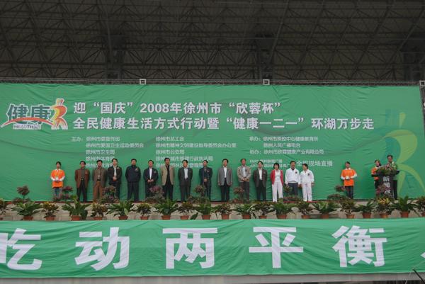 9月29日是“世界步行日”,上午8:15分我市在新体育中心广场举行“欣蓉杯”全民健康生活方式行动暨“健康一二一”活动启动仪式及环湖走仪式,主题为“日行一万步,吃动两平衡,健康一辈子”。本次活动由徐州市委宣传部、市总工会、市爱卫会、市文明办、市卫生局、市公安局、市行政执法局、市体育局、市教育局、市园林局10家单位联合主办;由徐州市疾控中心健康教育所、徐州广播电台承办;由徐州市欣蓉健康产业有限公司协办;市云龙湖风景区管理处、市云龙湖滨湖公园管理处为支持单位。徐州新闻广播和徐州健康体育广播全程现场直播。