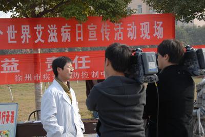 市疾控中心性艾科周长月科长在活动现场接受徐州电视台、徐州日报、都市晨报等新闻媒体采访。她重点对艾滋病概况、传播途径、防治知识、防治政策等进行了讲解,并对记者的提问进行了解答。此次活动共发放宣传材料2000余份,安全套、小礼品1000余份,收回调查问卷300余张。