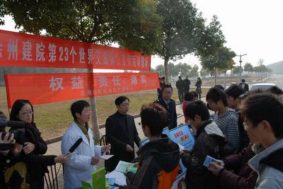 12月1日上午,徐州市疾控中心、泉山区疾控中心联合在徐州市建筑职业技术学院举办“世界艾滋病日”宣传活动。活动现场悬挂横幅,摆放宣传板,发放各种艾滋病宣传材料和各种小礼品,组织学生进行艾滋病知识问卷调查,市、区专家现场向学生传授艾滋病防治知识,并接受学生咨询。市卫生局张洪永处长、市疾控中心胥占忠副主任、泉山区卫生局周毅副局长等有关领导参加现场宣传。徐州出入境检验检疫局汪允侠处长及处室其他人员也到现场参与宣传活动。