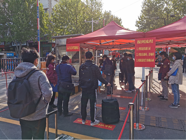 演练分为学生校外报到点和校区报到点两个场景,分别设置了出站口、缓冲区、报到区、候车区等节点位置,并在每个区域布置接待人员。从实际出发,围绕车站转运学生、体温检测和健康码查验、校门口错峰报到等各个重要关口,开展学生返校一般场景和特情处置场景的模拟演练。