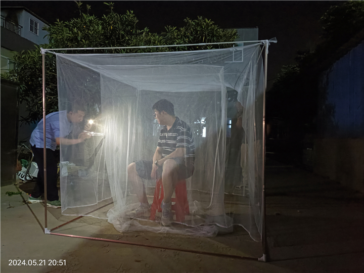 5月21日,市疾控中心地寄防科专业人员到铜山区对疟疾蚊媒监测工作进行现场指导。媒介按蚊密度监测采用灯诱法和人饵帐诱法。灯诱法:选择近人房(室内)和近水稻田(室外)且远离干扰光源并避风的环境各一处,悬挂诱蚊灯(诱蚊灯光源离地约1.5m),监测从日落后开始,连续诱集12小时,次日晨收,每半月1次,连续3天,进行种类鉴定,计算成蚊密度;人饵帐诱法:在人房处和野外各悬挂1顶双层叠帐,于19时至24时,一人坐于内帐中诱蚊,另外一人每小时起身到内帐外捕捉停落的按蚊,每次持续15分钟,记录每小时诱捕的蚊虫数量,计算成蚊的密度指数。经过一夜监测,现场捕获库蚊和伊蚊,未发现间日疟传播媒介中华按蚊。根据往年蚊媒季节消长规律,中华按蚊活动高峰出现在7月份。