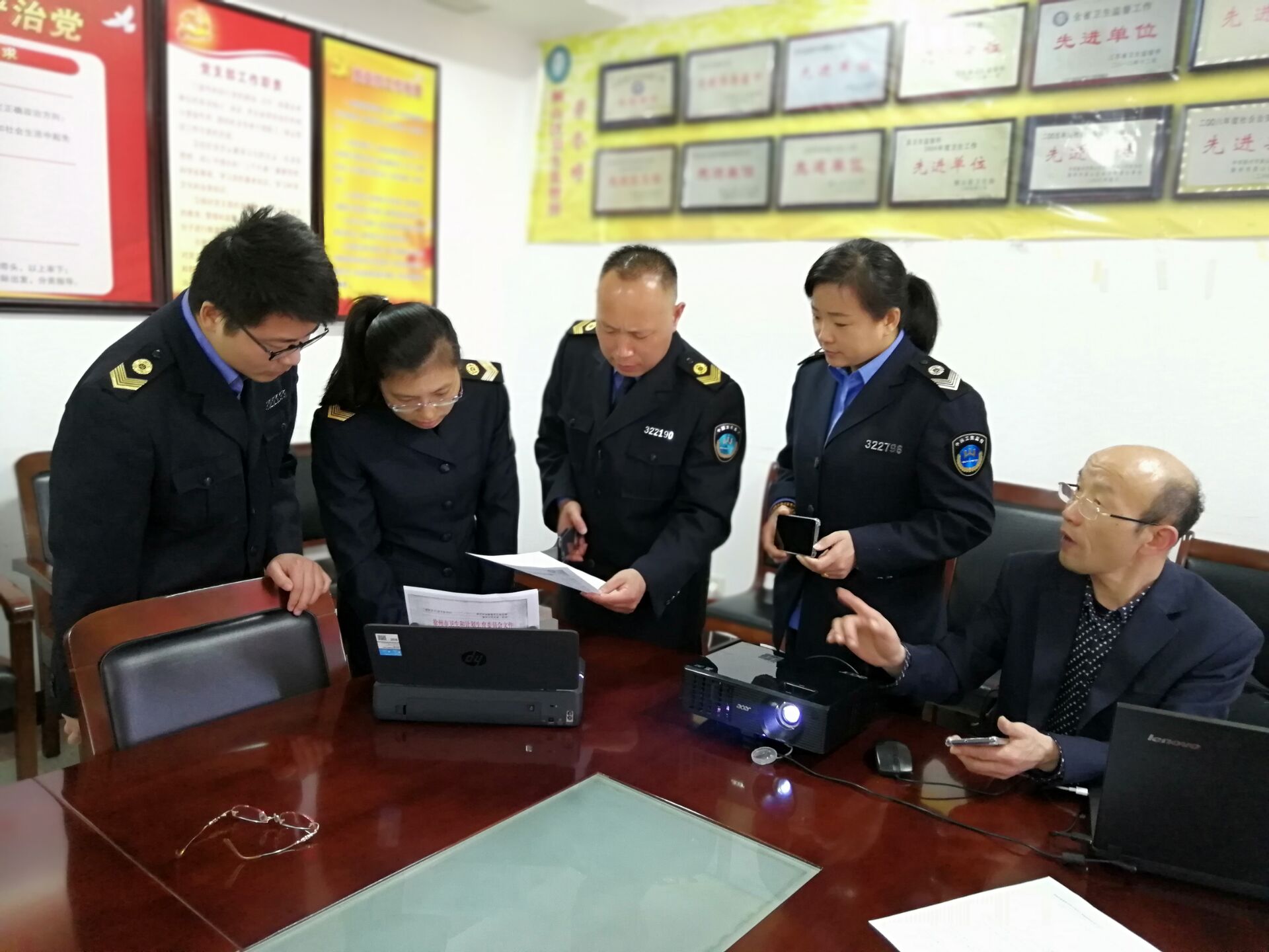 4月中旬,铜山所根据市所的要求配备了移动执法终端和便携式打印机并接入数据通讯网络,具备了使用条件。为使卫生监督员能尽快地上手使用,4月24日,该所对持有移动执法终端的卫生监督员进行了专门培训。刘春晓副所长主持本次培训,他首先宣读了区卫计委制定的《手持执法终端使用管理规定》,强调手持执法终端是固定资产,按工作需要分配给监督员使用,使用者应按照“谁使用、谁保管、谁 负责”的原则,由科室实行统一管理,定期进行维护保养。严禁执法人员擅自在终端上安装保存工作以外的任何程序、软件,严禁使用手持执法终端设备登录互联网进行聊天、游戏等娱乐活动,一经发现按违纪论处。该所卫监信息系统管理员闫化金科长进行了非常直观的讲解,他把执法终端数据线连接到手提电脑上,授课时他应用执法终端的全过程都能投影到屏幕上,将如何下载软件、登录APP、应用APP、如何连接便携式打印机、打印执法文书等一系列操作步骤进行了生动详细的讲解,大家一边听一遍看一边操作手中的终端,短短一上午时间,参训者个个掌握了手持执法终端的应用。