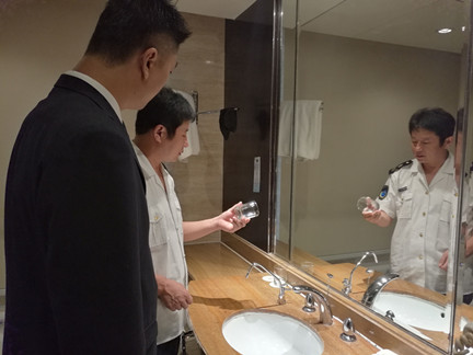 卫生执法人员对各宾馆的环境卫生,公共用品、用具,生活饮用水,客房卫生及空气质量等卫生指标进行了现场检查。在云泉宾馆,执法人员走进布草间和消毒间进行了查看。打开储藏柜,被罩、床单、毛巾等用品摆放整齐,且备注清晰明了。消毒柜正在消毒客人的茶杯和水杯,消毒好的杯具在储藏柜里摆放整齐。