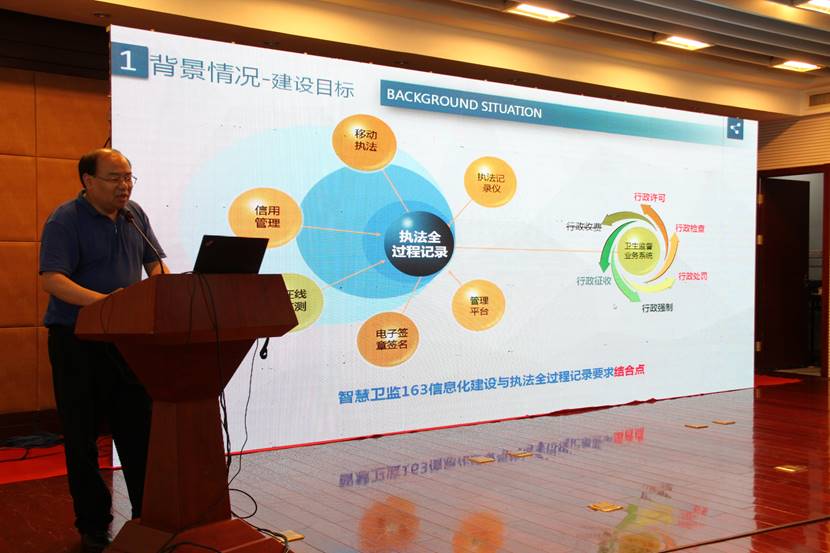 江苏省卫生计生委汪华副主任代表江苏省卫生计生委对前一段试点工作进行了总结,并对下一步试点工作提出了要求。省卫生监督所时玉昌所长从三个方面介绍了试点工作情况。首先介绍了“431”总体目标;然后从路径创新、制度创新、装备标准、信息化支撑、执法全过程初步实践等5个方面介绍了试点工作具体进展;最后对下一步试点工作提出设想。省卫生监督所王金敖副所长介绍了试点工作信息化建设初步成果,演示了南京执法现场应用执法记录仪所拍摄执法画面与会议现场的实时对接与互动。