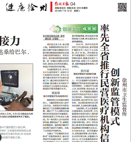 7月10日,徐州日报04版发表题为:创新监管模式,率先全省推进民营医疗机构信用评价的文章,对我所探索开展民营医疗机构信用评价工作进行全面报道。