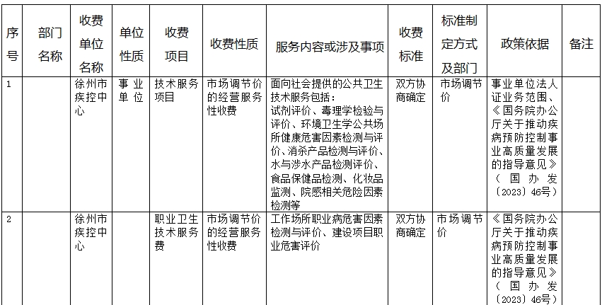 徐州市疾病预防控制中心综合性涉企收费和对外服务目录清单