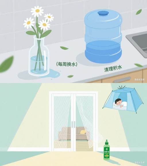 及时清理家中积水,花瓶、水箱等每周换水;安装纱门纱窗,睡眠使用蚊帐,必要时使用合规驱蚊产品;带孩子外出时尽量穿浅色长袖衣裤,避开蚊虫活动高峰时段(清晨和傍晚)。