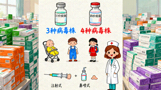 一是保护范围,我们有覆盖三种病毒株的三价疫苗和覆盖四种病毒株的四价疫苗。