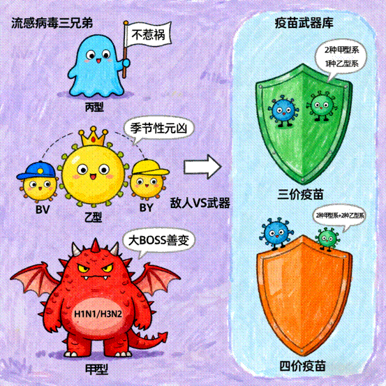 成员:三价裂解疫苗(应对2甲1乙)、四价裂解疫苗(应对2甲2乙,防护更全面)。