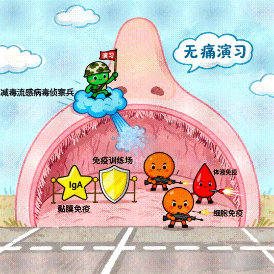 生动解释:这位“战士”不走寻常路。它从鼻腔进入,直接在呼吸道大门“布防”,训练黏膜免疫(产生抗体IgA),建立起抵御病毒的第一道防线。这个过程就像派出一支“特战小队”,让免疫系统进行一次高度逼真的“军事演习”,从而诱导出更综合的免疫反应(包括细胞免疫和体液免疫)。无痛、起效快是它的巨大优势,是怕打针孩子的福音。