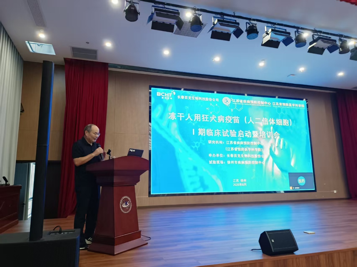 2025年8月29日上午,我市召开冻干人用狂犬疫苗(人二倍体细胞)I期临床试验启动暨培训会。江苏省疾控中心疫苗评价所所长潘红星、徐州市疾控中心副主任余加席、江苏省疫苗临床试验相关专家、长春百克生物技术股份公司及上海成泰医药科技有限公司代表和所有现场研究人员参加了会议。会议由徐州市疾控中心免规科科长宋晓哲主持。